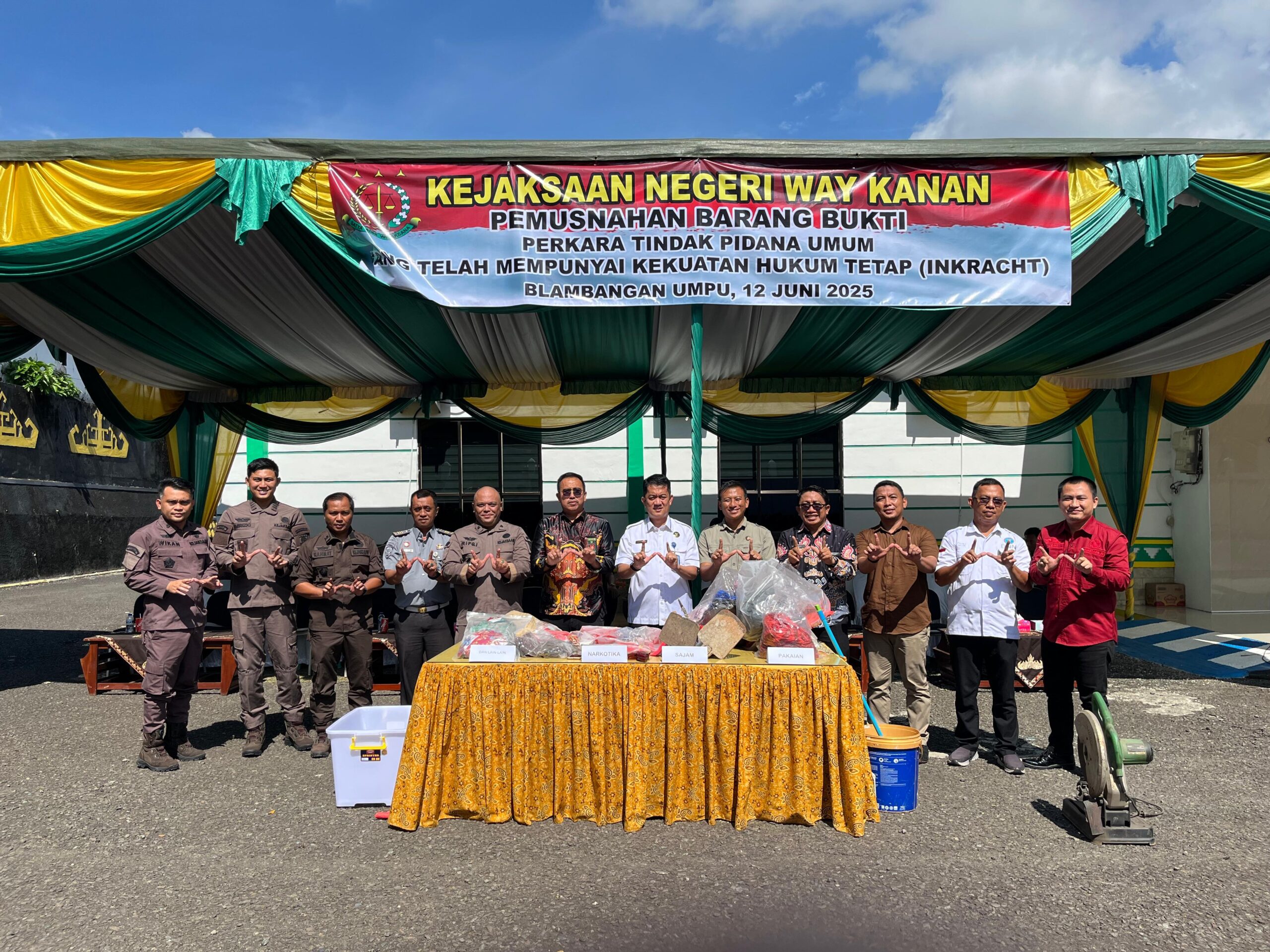 WAY KANAN, PemukaJaya.id – Kejaksaan Negeri Kabupaten Way Kanan Musnahkan Barang Bukti Tindak Pidana Umum Yang Telah Mempunyai Hukum Tetap (Incracht), Kamis(12/06/2025).