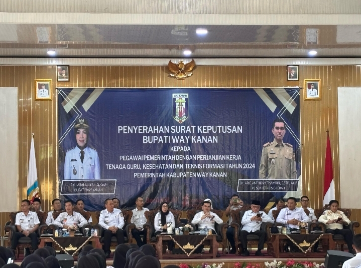 WAY KANAN, PemukaJaya.id – Bupati Way Kanan, Ayu Asalasiyah, S.Ked serahkan Surat Keputusan (SK), Surat Pernyataan Melaksanakan Tugas (SPMT), dan Kontrak Perjanjian Kerja bagi Pegawai Pemerintah dengan Perjanjian Kerja (PPPK) di Lingkungan Pemerintah Kabupaten Way Kanan. di Gedung Pusiban, Rabu (16/07/2025).